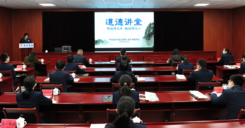 12月6日,為貫徹落實黨的二十大精神,大力培育和踐行社會主義核心價值觀,進一步弘揚誠信文化,提高全民誠信意識和個人品德建設,由中共南平市委文明辦、市稅務局聯合開展,以“傳誠信之美,做誠信之人”為主題的道德講堂在潭開講。南平市委文明辦、市稅務局有關領導及南平市稅務局各部門40人參加了本次講堂。