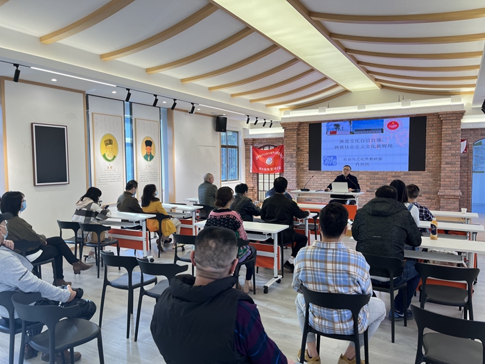 講座中,肖劍南教授根據黨的二十大報告中提出的“推進文化自信自強,鑄就社會主義文化新輝煌”,圍繞舉旗幟、聚民心、育新人、興文化、展形象建設社會主義文化強國五個方面進行深入淺出的闡述。