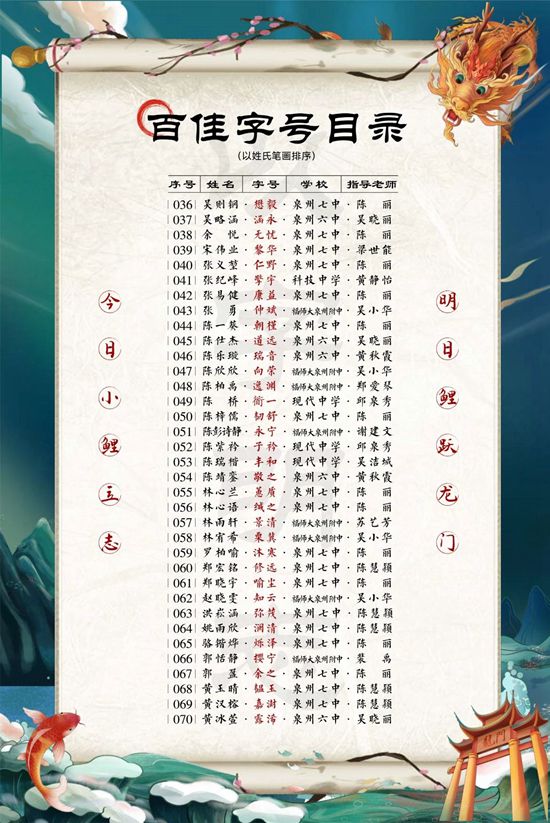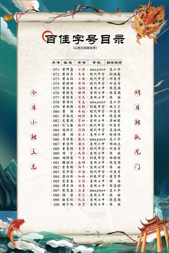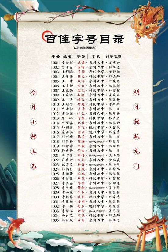 據悉,此次活動由鯉城區委宣傳部、鯉城區委文明辦、鯉城區教育局、鯉城團區委、鯉城區社科聯共同主辦,于今年9月正式啟動,學生在老師和家長的指導下,通過查閱資料、請教老師等方式,為自己取“字”,從中汲取中華優秀傳統文化的力量,以“字”明志,堅定人生理想。活動共吸引了全區中學生2820人參與。