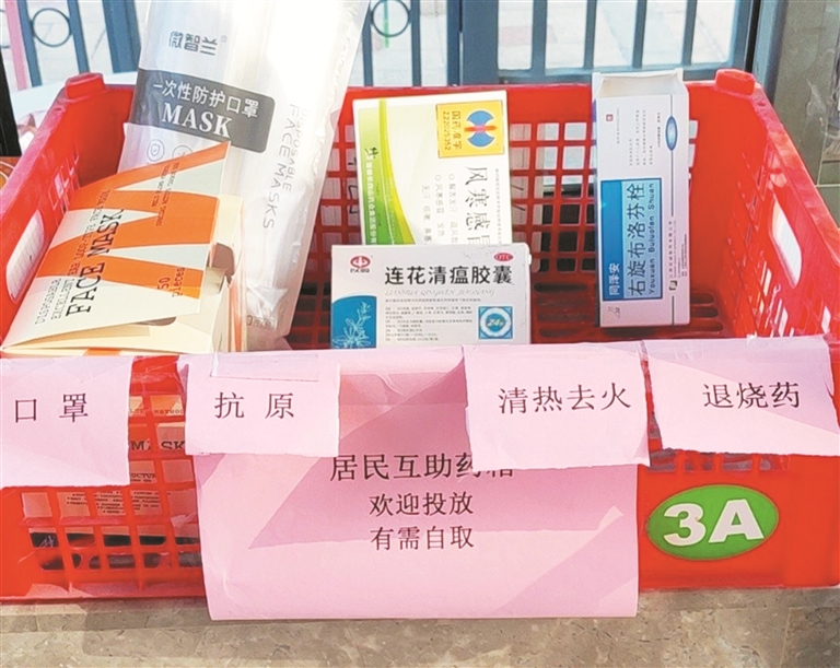 風(fēng)寒感冒顆粒、醫(yī)用退熱貼、復(fù)方魚(yú)腥草合劑、板藍(lán)根顆粒……多種藥物擺放在藥箱內(nèi)。前來(lái)放置藥品的王女士告訴記者,不知道自己帶來(lái)的藥能不能用得上,希望能幫到鄰居們。