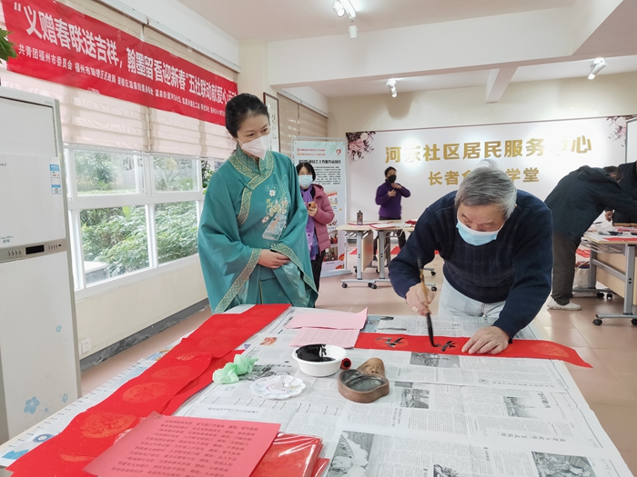 文明風1月6日訊 臨近新春佳節之際,為營造喜慶的社區氛圍,為特殊人群送溫暖,構建友好社區環境,近日,共青團福州市委員會、鼓樓區民政局、溫泉街道辦事處、溫泉街道河東社區、溫泉街道社工站、福州市小桔燈社會工作服務中心、陽光詩社共同舉辦“義贈春聯送吉祥,翰墨留香迎新春”五社聯動獻愛心活動。
