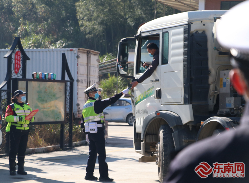 交警為過往車輛發(fā)放安全出行宣傳冊。 東南網(wǎng)記者 潘月容 攝