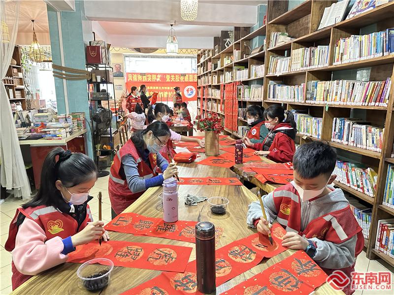 優(yōu)秀學(xué)生代表們揮毫潑墨寫春聯(lián)(李林村新時(shí)代文明實(shí)踐站供圖)
