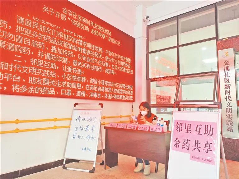 號召一經發出,便吸引了許多社區居民參與。記者看到,金溪社區新時代文明實踐站門口,連花清瘟膠囊、退燒貼等各種功能不同的藥品已經過分類,擺放在不同“藥箱”中。“我們社區情況特殊,老年人和重癥特別多,他們腿腳不便且不懂如何進行網上問診,所以購藥不便,藥物少。因此,我們想通過這個方式,讓有余藥的人勻一點點出來,讓大家伙守望相助。”金溪社區黨支部書記李美希告訴記者。