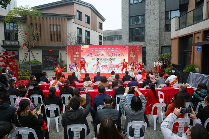 開場(chǎng)舞《濱江福地醉美臺(tái)江》拉開了活動(dòng)的帷幕,文明家庭宣傳評(píng)話《環(huán)衛(wèi)英雄》、伬唱《榕城十八味》、歌曲《好日子》《歡天喜地》《共筑中國(guó)夢(mèng)》、器樂(lè)演奏《夢(mèng)回雙杭》、詩(shī)朗誦《向著光榮與夢(mèng)想的新征程奮進(jìn)》、舞蹈《潮動(dòng)未來(lái)》《歡樂(lè)福年》、“福”文化與文明創(chuàng)建互動(dòng)問(wèn)答等節(jié)目,將現(xiàn)場(chǎng)氛圍推向高潮,古色古香的傳統(tǒng)文化演出讓觀眾沉浸式體驗(yàn)中華傳統(tǒng)節(jié)日和福文化的豐富內(nèi)涵,激昂奮發(fā)的愛國(guó)主義文藝演出則鼓舞著觀演群眾“奮進(jìn)新征程,建功新時(shí)代”。