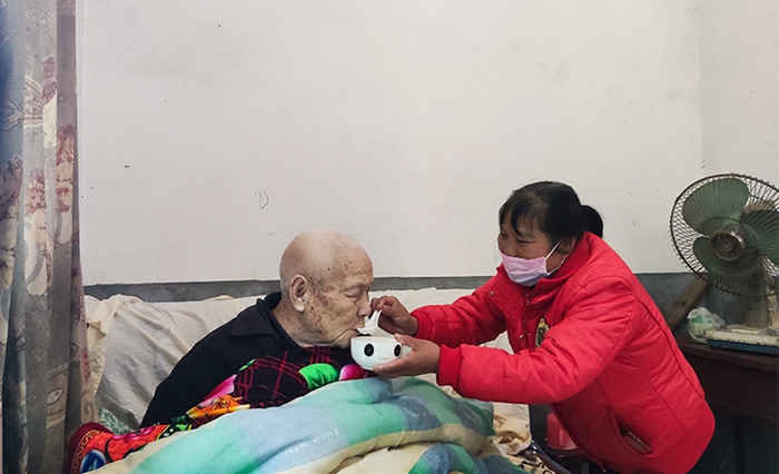 堅強的雷玉春并沒有被苦難的生活擊垮,自那以后,她幾乎十年如一日,承擔起了照顧父親的重擔。雷家順不能動彈,她就收拾好一樓空氣、朝向最好的房間給父親住。為了便于照顧父親,她也將休息的地方搬到一樓大廳,累了就在緊靠著父親房間的大門口躺椅上休息。只要雷家順一聲呼喚,她就會利索地起來,為父親清理排泄物、擦洗身子,還要強打起精神陪老人聊天解悶。