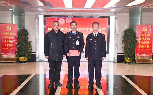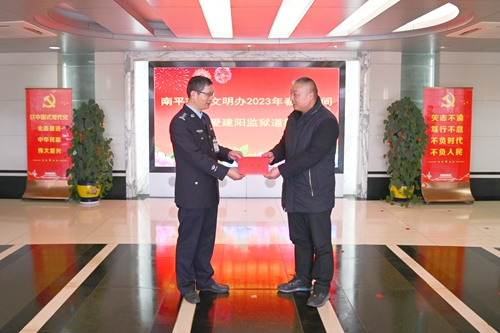 文明風1月19日訊 為進一步推動全社會尊敬、關愛、學習道德模范,營造“德者有德、文明有福”的濃厚氛圍,在2023年新春佳節來臨之際,南平市委文明辦副主任賴丹萍到建陽監獄禮遇慰問南平市第八屆敬業奉獻道德模范楊開鋒,監獄黨委副書記、政委周震亞代表監獄黨委歡迎慰問組一行并向楊開鋒表示祝賀。