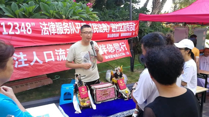 2021年7月,東山縣司法局"12348”法律服務隊普法志愿者陳銀龍進社區開展《民法典》宣傳活動