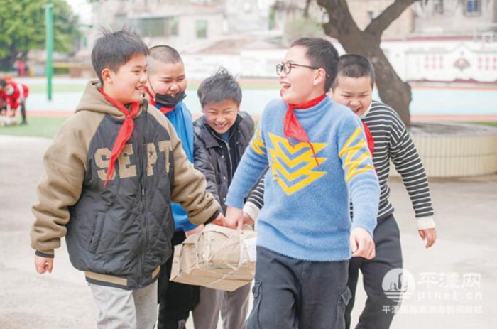 在實(shí)驗(yàn)小學(xué),學(xué)生們一起搬運(yùn)新學(xué)期的教材。