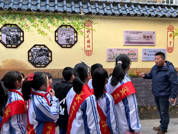 活動中,少先隊員們在福全社區書記的講解中參觀了“福見福全”文化長廊,聆聽打響解放桐山第一槍的革命故事,了解福全社區人文故事,深切地感受古巷文化。社區彩繪長廊展示了一幅幅動人的歷史畫面,例如“糧站”“糧票”“百貨大樓”等,如今已變成現代化的超市、學校、餐廳,隊員們感受福全社區的歷史與人文魅力同時也在感嘆時代的發展,社會的進步,感恩如今的幸福生活,敬仰老一輩人的付出。
