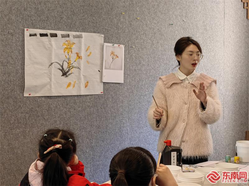 “墨韻丹青,人文蓮亭”書法國畫公益課程中,國畫課老師現場授課。(蓮亭社區新時代文明實踐站供圖)