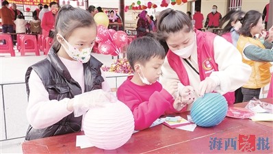 臺青志愿者教小朋友制作花燈。(方艷艷 攝)