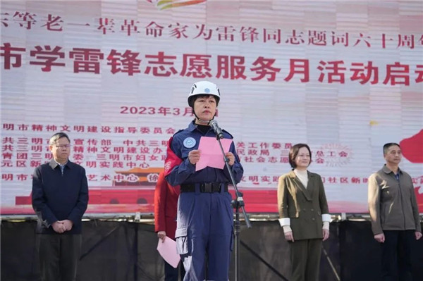 三明藍天救援隊吳玉清作為志愿者代表宣讀學雷鋒倡議書