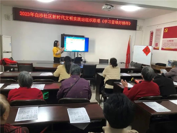白沙街道白沙社區新時代文明實踐站組織歌唱《學習雷鋒好榜樣》。