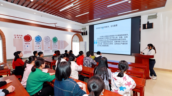 活動現場,學生和家長共同參與游戲環節——“你我‘心’同行,讓我做你的‘眼睛’”,孩子們和父母敞開心扉,共同交流,促進了親子之間的相互信任和依賴;“大手牽小手 文明陽光路上一起走”為主題的心理健康知識講座和視頻,讓父母深知自己首先要時時處處做好表率,當好文明人,才能給孩子樹立好榜樣,自覺養成文明的好習慣;“成長路上,感恩有你”互動按摩操則讓孩子用幫父母按摩的方式感恩父母多年來的辛苦付出,進一步拉近了親子關系。