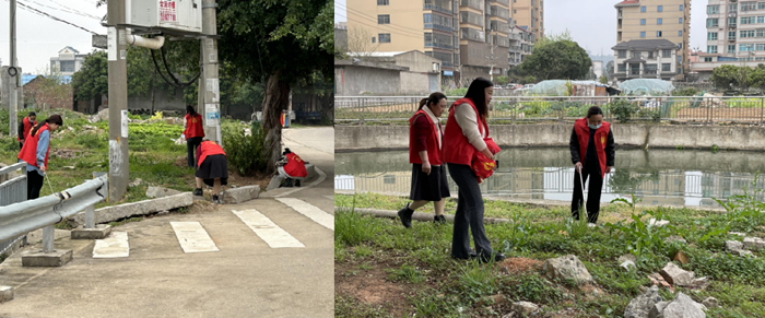 宣講結束后,大鶴林場黨員志愿者隨即與社區志愿者們身穿紅馬甲,帶上撿拾垃圾工具和宣傳冊子共同到湖南社區河邊、 房前屋后開展“護河愛水、清潔家園”學雷鋒志愿服務。