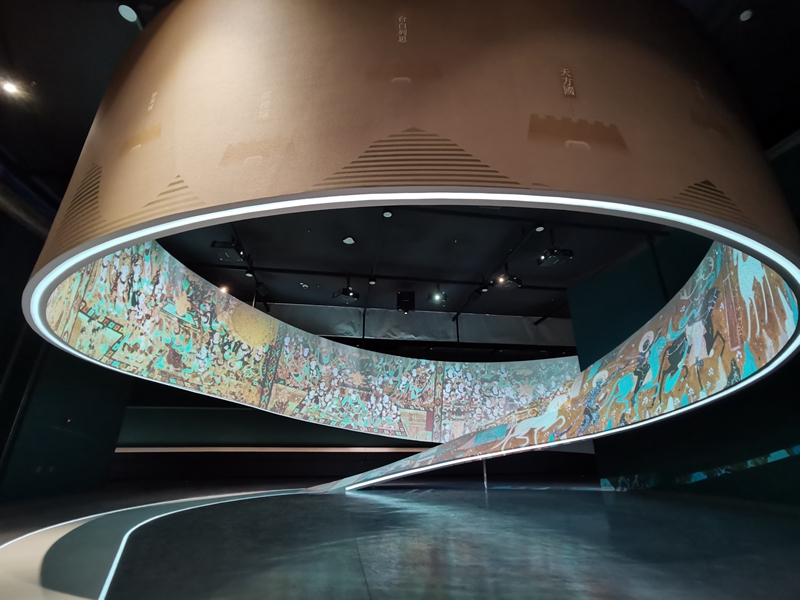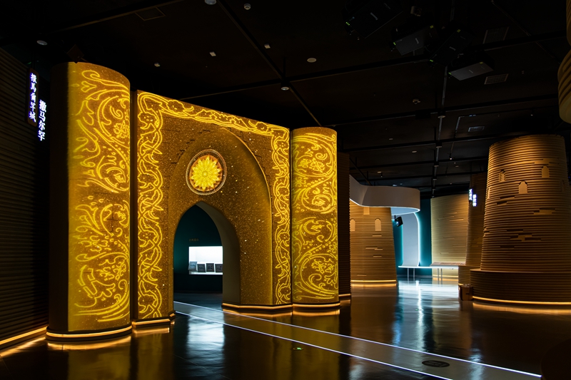 海上絲綢之路展與絲路山水地圖多媒體數字展擬設在秋榮樓,取西方白虎位,四季當秋,寓意“一帶一路”的繁榮昌盛,成果如累累秋實。設“發現海絲”、“大洋之路”、“以港為眼”、“海絲新生”四個單元,從考古遺跡至泉州港的前世今生,從石獅市的海上絲綢之路古遺跡至如今成為亞洲最大的服裝之城,將城市的發展置于絲綢之路的歷史背景下,娓娓講述絲綢之路帶給這座城市的巨變。“絲路山水地圖多媒體數字展”則由國寶展示區、環幕影院區和五城游歷區三區構成,以陸上絲綢之路為主體,以繪制于明朝中后期的《絲路山水地圖》為線索,通過地圖上嘉峪關、敦煌、撒馬爾罕、赫拉特、麥加五大城市作為空間動線闡述“重走絲路?發現之旅”的主旨。