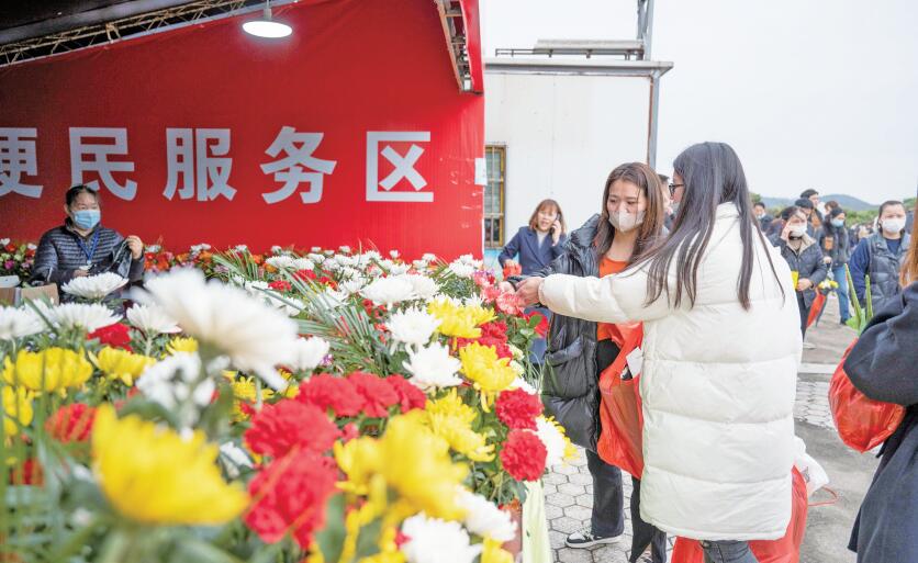 據(jù)東海陵園負(fù)責(zé)人游貞介紹,為了迎接祭掃高峰,陵園內(nèi)增設(shè)了4個(gè)便民服務(wù)點(diǎn)和3處衛(wèi)生間,以及便民服務(wù)點(diǎn)的花束等各項(xiàng)物品。