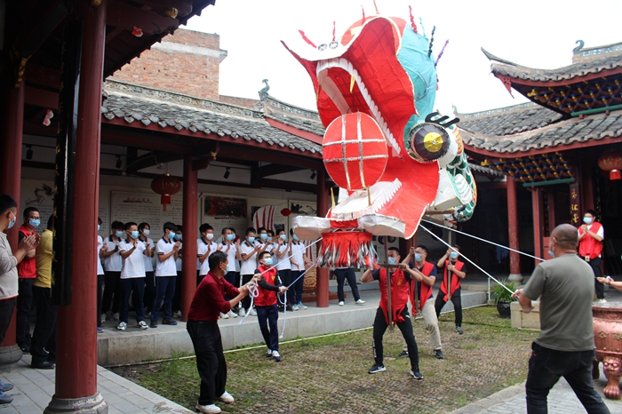 學(xué)生在連城縣姑田大龍展陳館觀看志愿者抬龍頭