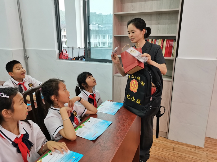 發揮女法官親和力強,有善于溝通的優勢,2021年7月,成立“背包法庭志愿服務隊”,開展巾幗法官進校園、模擬法庭宣教活動,構建起“院家校”三位一體協同保護模式。