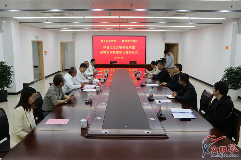 文明風4月26日訊 4月24日,浙閩皖贛(衢南黃饒)四省邊際文明有禮聯盟合戰略合作框架協議簽訂儀式在南平舉行。衢州市委宣傳部副部長、市文明辦主任、市創建辦主任吳德生與南平市委宣傳部部務會成員、文明辦主任黃益水現場簽訂協議并座談。