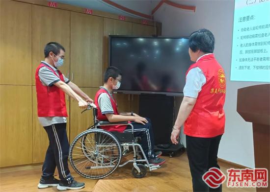 盧秀毅指導志愿者掌握使用輪椅的正確方法(集美·誠毅志愿者聯盟供圖)