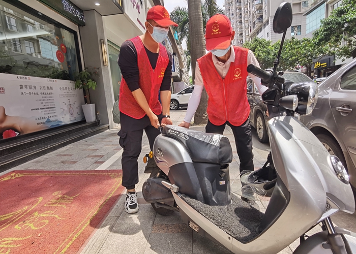 4月15日,薌城區巷口街道東園社區志愿者合力整理亂停亂放的電動車 張旭 攝