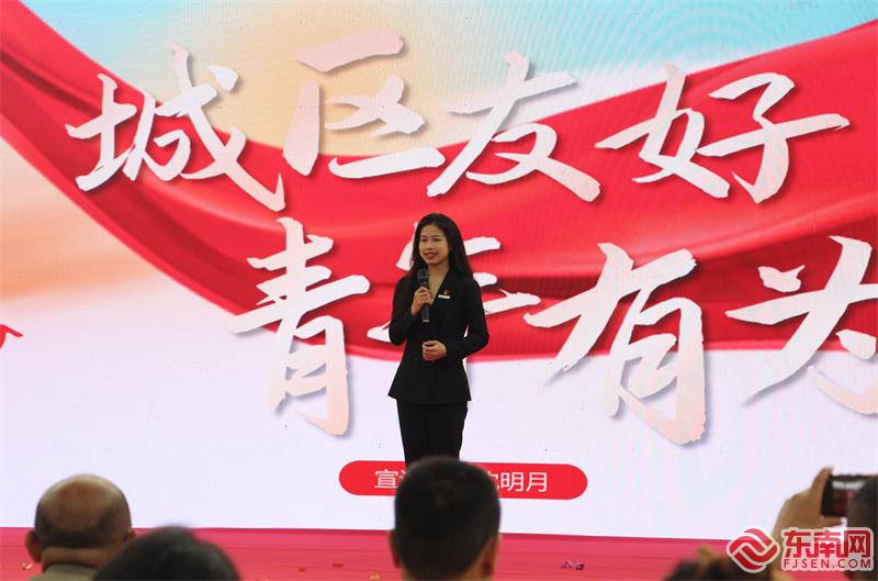 “宏偉藍(lán)圖鼓舞人心,時(shí)代號(hào)角催人奮進(jìn)?!眴?dòng)儀式現(xiàn)場(chǎng),集美大學(xué)學(xué)子郝雨昕、沈明月、李皓分別以《做堅(jiān)定的青年馬克思主義者》《城區(qū)友好,青年有為》《護(hù)青山綠水,助河海安瀾》為題演講。