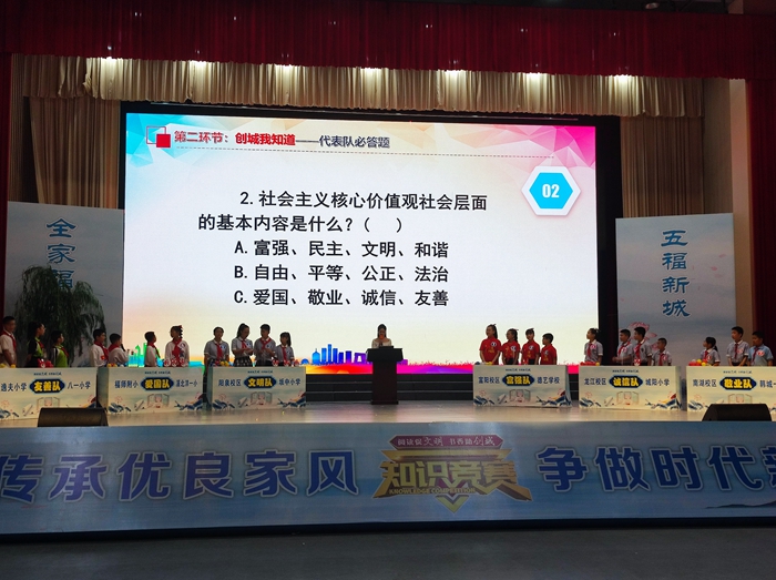 在知識競賽環節,各代表隊圍繞黨的二十大精神、社會主義核心價值觀、“傳承優良家風 爭做時代新人”全國青少年愛國主義讀書教育活動、“金種子”閱讀,以及創城、文明禮儀、交通安全知識、“福文化”等內容,開啟了必答題、搶答題、團隊加分題、團隊默契賽等環節的激烈角逐,通過競賽增進學生們的閱讀和創城意識,激勵他們自覺踐行社會主義核心價值觀,爭做時代新人。