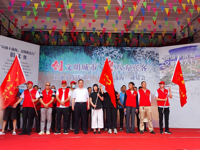 動員會上,與會代表宣讀了“垃圾不落海 文明我先行”倡議書,相關(guān)負(fù)責(zé)人為“垃圾不落海”志愿服務(wù)隊授旗。