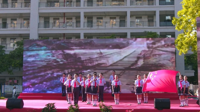 紅旗飛揚(yáng),歌聲歡暢。演出活動(dòng)在鼓號(hào)《拉德斯基進(jìn)行曲》中拉開序幕,演出分為《童心向陽》《文明雅行》《美好未來》三個(gè)篇章。學(xué)生們身著節(jié)日盛裝,在歡樂的樂曲中,用開心的笑臉、歡快的歌舞、美妙的歌聲,盡情抒發(fā)著對(duì)節(jié)日的熱愛和喜悅之情,現(xiàn)場(chǎng)洋溢著和諧、喜慶的節(jié)日氣氛。