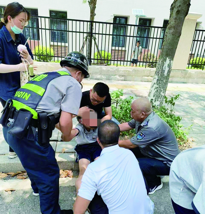 手上一陣鉆心的刺痛傳來,張金堆還是毅然堅持。時間一點一滴過去,3分鐘后,女生咬住張金堆手指的力量逐漸減小,停止了抽搐。大家一起把女生扶到樹下陰涼處。此時,他們察覺女生體溫很高,疑似發高燒,他便將女生的鞋襪脫掉,用手沾了一些水,輕輕拍打她的額頭以降溫。由于當時是正午,烈日高照,張金堆將孩子抱起,送往保安室休息。蔡賜發趕緊上前為他們撐傘。