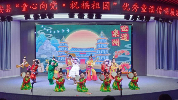 活動中,孩子們通過多樣的形式、新穎的構思傳遞童謠的魅力,唱響童心向黨、歌頌祖國、熱愛家鄉的主旋律。《祖國祖國我愛你》《黨是咱的好靠山》等一首首朗朗上口、旋律動聽的原創童謠滿載孩子們的愛國主義情懷,表達了對黨濃厚的熱愛之情;《惠安愈來變愈昳》《惠安韻·家國情》極富惠安本土特色,贏得了現場陣陣掌聲;《婀娜咱的惠安女》充分展示了新時代惠女精神,贊美了惠安女勤勞智慧和創新進取;《古樂南音》被孩子們用豐富的表現形式精彩演繹,美輪美奐、童趣十足。