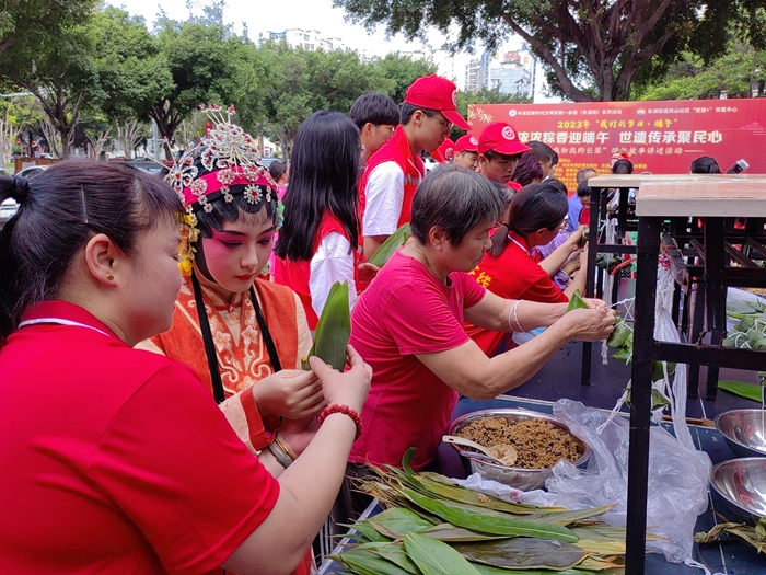 在活動現(xiàn)場,豐澤區(qū)新時代文明實踐一條街(東湖街)成員單位的志愿者們在現(xiàn)場提供反詐、綜治、普法、掃黃打非、消防安全等宣傳咨詢。來自鳳山社區(qū)的二三十名老人,現(xiàn)場比賽包粽子,翠綠的粽葉裹上白色糯米,加進各種五花肉、雞蛋等佐料,剛成型已經是香飄四溢。“以往端午節(jié),一般都是開展包粽子活動,這次有高甲戲、提線木偶戲表演,看這么精彩的演出,很特別也很有意義!” 居民胡先生說,家門口能看到往日舞臺上的演出,實在過癮,這才是弘揚中華民族優(yōu)秀傳統(tǒng)文化、非遺文化的“正確打開方式”。