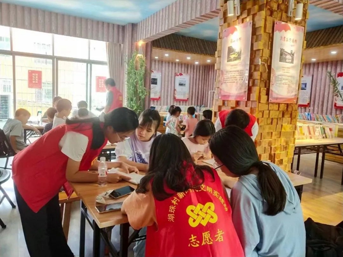 農家書屋是全民閱讀的主陣地、大平臺。“這里不僅是政策宣講堂、村民農技‘充電所’、文化‘休閑站’,還是孩子的‘小樂園’。”湖珠村黨總支支委林偉華介紹說,書屋都會定期組織親子、科普等各種讀書活動,同時還與大學生社會實踐活動結合,舉行“大手牽小手”大學生志愿者課程輔導活動,大學生們利用暑假時間為湖珠村留守兒童提供功課輔導服務,不僅滿足了大學生社會實踐要求,也為湖珠村留守兒童創造了良好的學習條件。