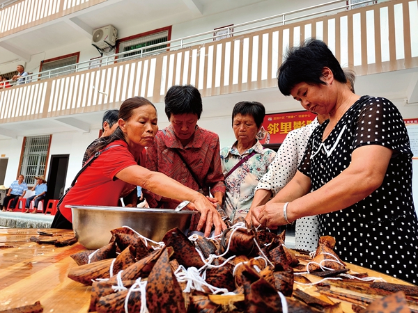 在雷峰鎮蕉溪片區“黨建+”鄰里中心,精彩的非遺文化——木偶戲在舞臺上輪番上演,轄區老人與志愿者在愛心食堂里一同捋粽葉、包粽子、捆棕繩,共迎端午。活動還為全村60歲以上老人送上大米和糧油等慰問品,用心用情關懷留守老人的生活。