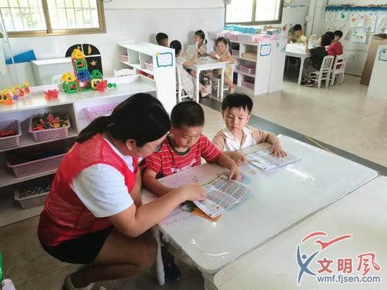 志愿者鼓勵孩子們愛讀書、讀好書、善讀書(鴻山村新時代文明實踐站 供圖)