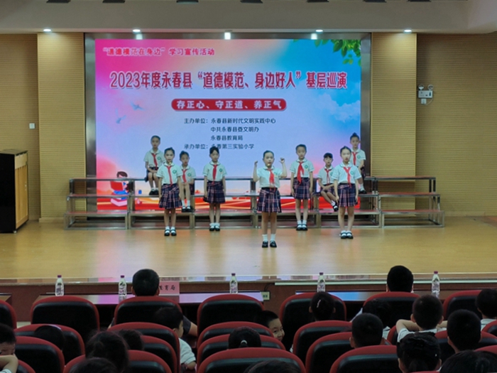 泉州市委宣傳部、泉州市委文明辦、泉州市文聯、永春縣文明委聯合在永春縣第三實驗小學舉辦“2023年度泉州市‘道德模范、身邊好人’基層宣講(永春專場)”活動?;顒右孕v三位永春籍省、市“道德模范、身邊好人”為主線,中間穿插進行非洲鼓、合唱、情景劇等相關主題文藝演出,為現場觀眾呈現一場精彩紛呈、事跡感人的視覺盛宴?;顒咏Y束后,大家紛紛表示對三位永春籍省、市“道德模范、身邊好人”的事跡感觸頗深,實現了用身邊人講身邊事、身邊事教身邊人,共同見證道德的力量,深刻感受到道德力量的引領和激勵。泉州市委宣傳部、泉州市委文明辦、泉州市文聯、永春縣文明委還聯合在永春縣一中舉辦“2023年度泉州市‘新時代好少年’基層宣講(永春專場)”活動。永春縣新時代文明實踐中心、永春縣委文明辦、永春縣教育局還聯合在永春縣第三實驗小學舉辦“2023年度永春縣‘道德模范、身邊好人’基層巡演”活動。