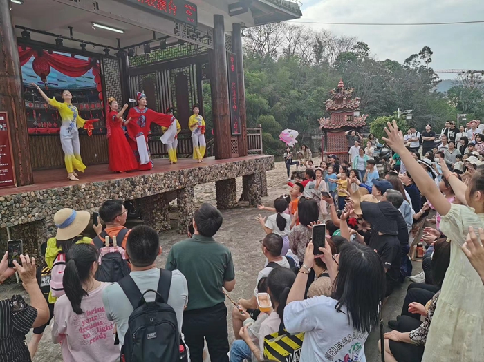 五一期間福建土樓(南靖)景區新時代文明實踐所“土樓非遺民俗”宣講隊與游客互動
