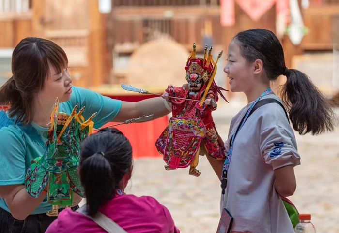 外地小游客向福建土樓(南靖)景區新時代文明實踐所非遺傳承人學習掌上木偶