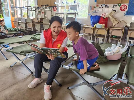 志愿者楊東燕在群眾轉移安置點給小朋友講故事。(翔安區委文明辦供圖)