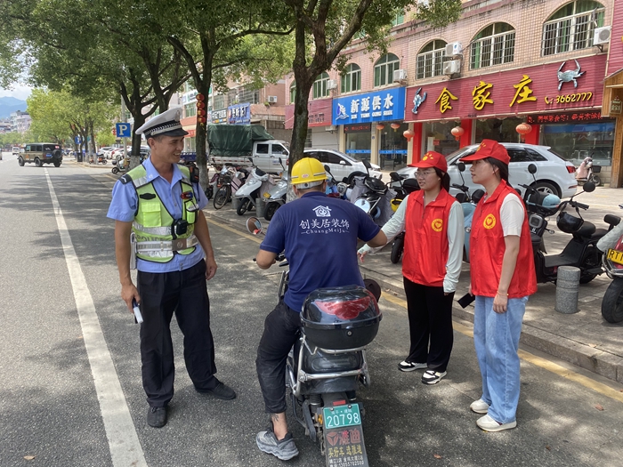 文明督導員勸導駕駛員佩戴安全帽。建甌市文明辦 供圖