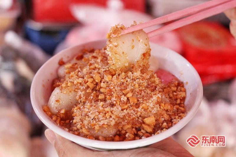 泉州的糖粿分紅、白兩色,形狀好似初生孩子臉上的小酒窩,寓意孩子健康成長。東南網記者 林婕 攝