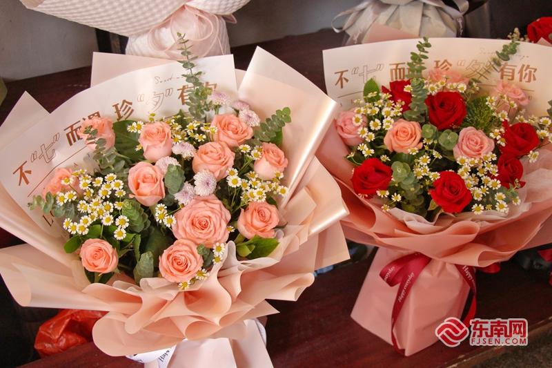 在市區花巷附近的一家花店內,貨架上擺放著不少已捆扎好的花束。不少鮮花店為了迎合客戶的需求,特意推出了“七夕專區”。東南網記者 林婕 攝