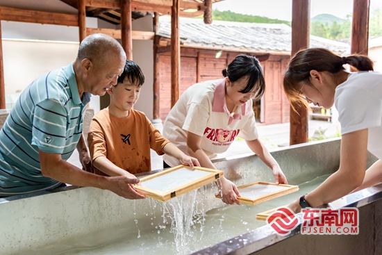 “南埕鎮聚焦非物質文化遺產‘古法造紙技藝’,將非遺和研學、文創相結合,利用老舊古屋修舊如舊,創建古法造紙技藝館,讓游客在體驗中感受非物質文化遺產的魅力。”南埕村黨支部書記林光明介紹。