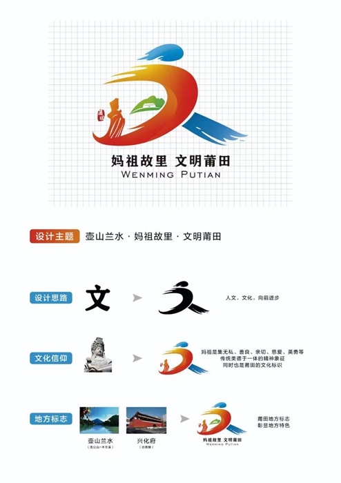 “文明莆田”形象標識整個設計的主題圍繞“壺山蘭水、媽祖故里、文明莆田”展開。主元素圍繞文明的“文”展開,代表人文、文化,同時又像一個向前奔跑的人像,代表“向前進步”的奮斗力量,融入莆田媽祖文化,媽祖是集無私、善良、親切、慈愛、英勇等傳統(tǒng)美德于一體的精神象征,是莆田的文化標識。同時,融入莆田地方標志,包括壺山蘭水、興化府等,彰顯地方特色。