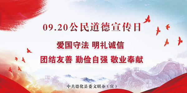 今年9月20日是全國第二十一個“公民道德宣傳日”,長期以來,德化縣通過公民道德宣傳活動,廣泛動員社會各界關心支持和參與道德建設,使公民道德建設貼近實際、貼近生活、貼近群眾,增強針對性和實效性,促進公民道德素質和社會文明程度提高。