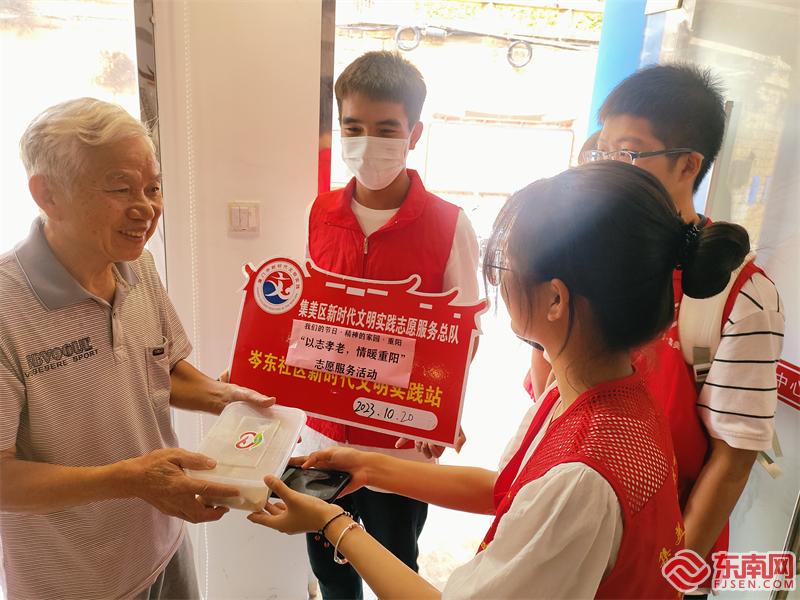 集美大學生青年志愿者上門為老人送餃子(岑東社區新時代文明實踐站供圖)