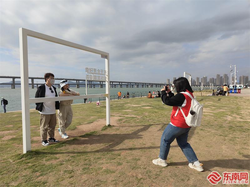 在志愿者們的熱情邀請下,眾多游客積極參與互動問答。“您知道集美之眼的視野跨度是多少嗎?”“您聽過五龍戲珠的傳說嗎?”志愿者拿著圖文并茂的景觀展示圖,通過精彩講解向游客科普十里長堤的“集美之眼”“五龍戲珠”“蔡林夕照”等景觀文化,為游客解鎖更豐富的玩賞體驗,將“文明旅游”的理念根植入游客的心中,讓志愿熱情澆灌的文明之花在十里長堤綻放異彩。不僅如此,景點路線引導、協助游客拍照等服務也應邀熱情“上線”,讓游客在游玩、賞景的同時,沉浸式感受著一份專屬于集美的文明風尚魅力。