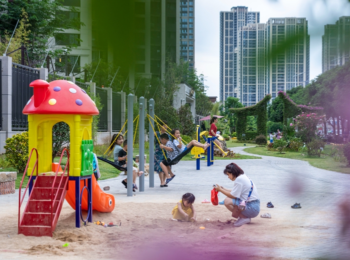 市民在龍文區石倉南路君領首府旁的口袋公園休閑游玩。張旭 攝